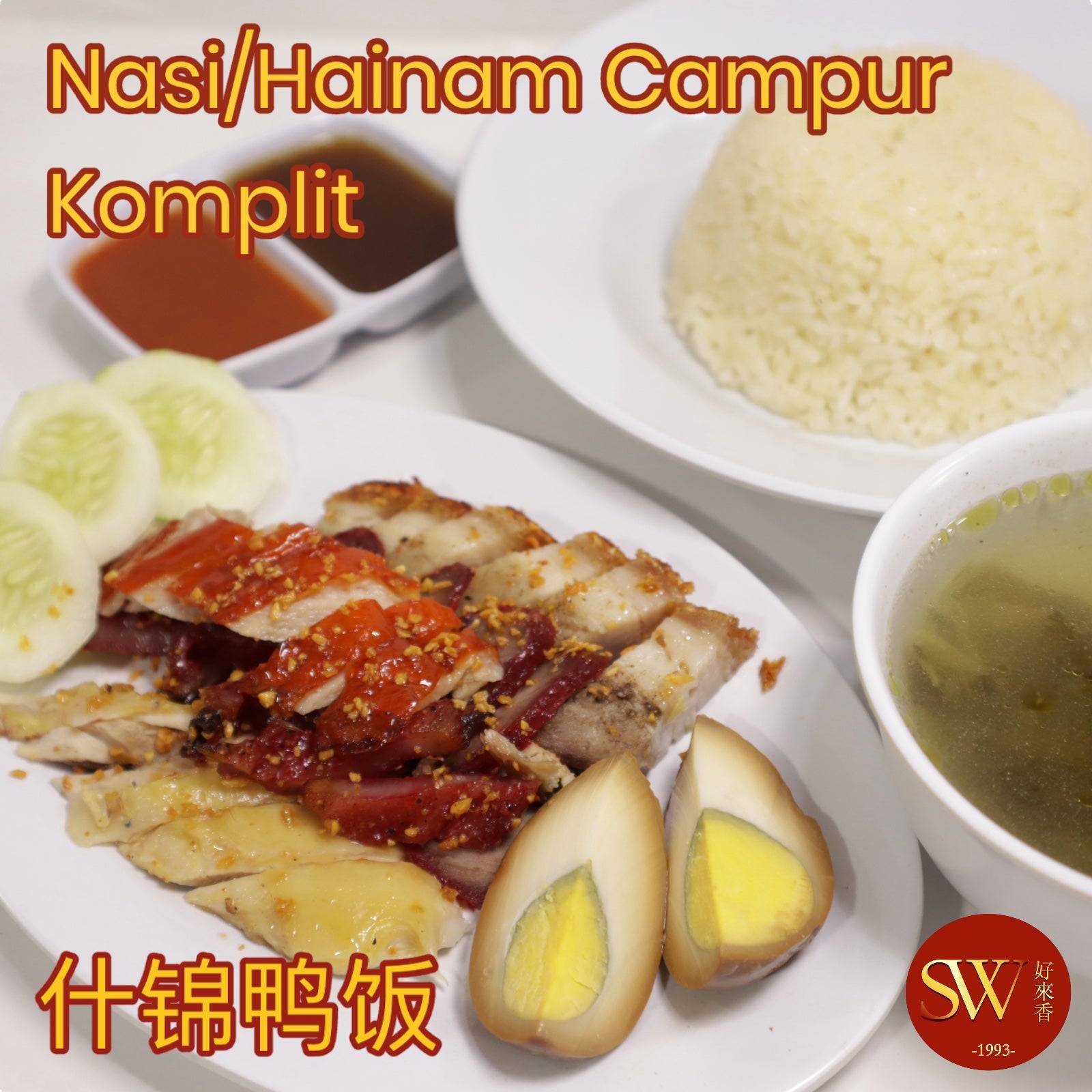 Nasi/Hainam Campur + Bebek Panggang + Babi Panggang + Chasio Madu + Chasio Daging + Ayam Panggang/Rebus + Telur Kecap + Kuah Sayur Asin + Saus Hoisin + Saus Sambal.